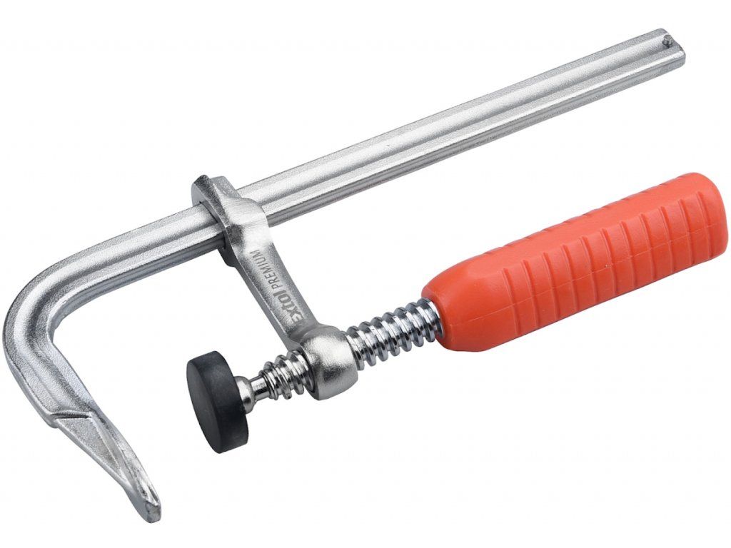 Stolárska zvierka typ „F“, jednoliaty masívny profil, dosadacie plôšky kryté plastom, ergonomická plastová rukoväť.